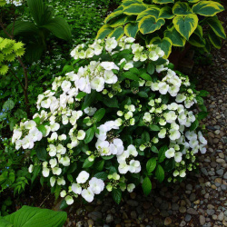 Очень компактная гортензия с очень тёмными зелёными листьями. Цветки белые, со временем постепенно розовеют. Куст высотой 80 см и диаметром 70 см.