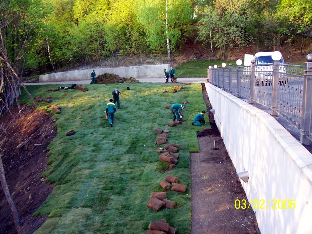 Раскатайте рулоны готового газона так, чтобы их края соприкасались друг с другом. Наложение краев лент газона или свободное пространство между ними недопустимо. Бороздки между лентами газона заполните такой же или связывающей почвой. Чтобы разровнять образовавшиеся бугорки и неровности после укладки готового газона, слегка прикатайте поверхность катком. В жаркую и сухую погоду в течение первых нескольких недель газон необходимо обильно поливать. Лучшее время для полива – раннее утро и поздний вечер, т.е. время, когда солнце наименее активно.