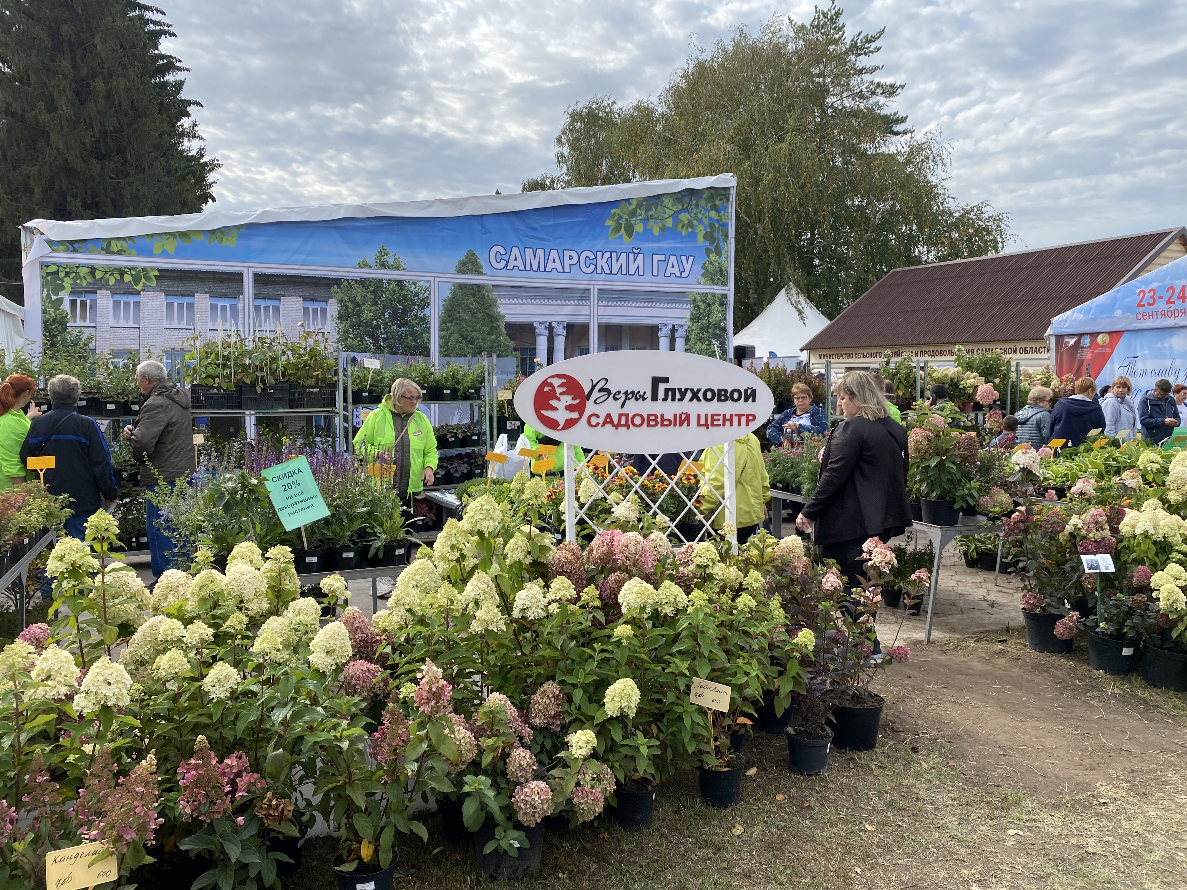 На все декоративные растения и на гортензии скидка 20% кроме плодовых.