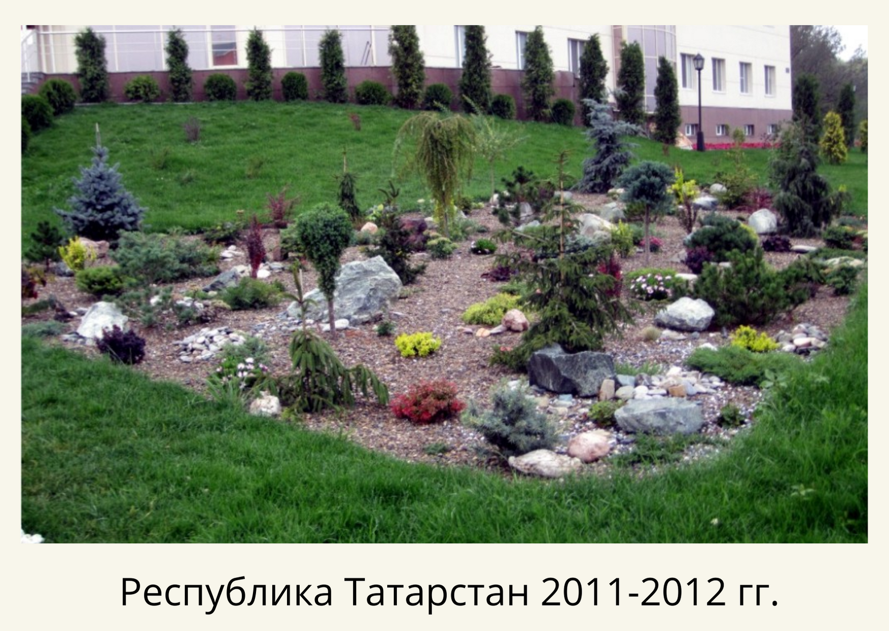 Территории были ухожены, но вместо газона – травяная поросль, цветники переросли, высажено много хвойных растений, но без видимой концепции. Мы постарались исправить данную ситуацию. Удалили сорняки, перекопали, завезли чернозем, постелили рулонный газон и частично отреставрировали существующий на площади 1,5 га. Пересадили и привели в порядок существующие насаждения. Сделали бордюрные цветники с однолетниками (петуния, тагетис, пеларгония, бегония) 10 000шт, рокарии, розарий из бордюрных голландских роз Патио и высадили декоративных хвойных и лиственных растений 1240 шт.